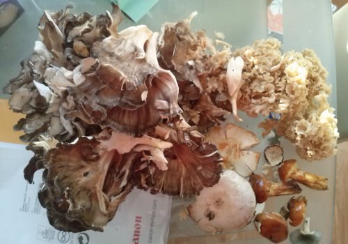 Wie das Foto zeigt, habe ich am vergangenen Wochenende eine kleine Pilzmahlzeit gefunden, die sich hauptsächlich aus jungen Maronen, Violetten Rötelritterlingen, Safranschirmlingen, Stäublingen, Okertäublingen und einem Trupp Mönchsköpfen zusammensetzte.
