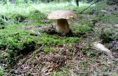 Innerhalb einer knappen Stunde fanden wir in Sichtweite vom Wegesrand zwei Steinpilze, zwei Rotkappen und einen Birkenpilz (Foto rechts). Zum Glück waren alle Pilze madenfrei!