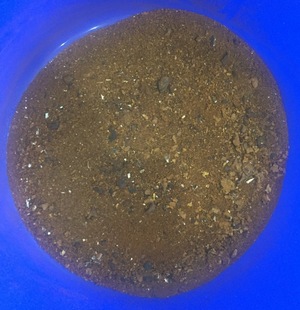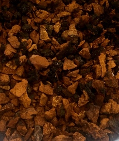 2 Fotos: Hier ist der Chaga nach Vorarbeit in groben (links) und mittelgroben Stücken (rechts) zu sehen. Auf dem Foto hierunter sehen wir in der blauen Schüssel beinahe schon feines Schrot vom Chaga. Es eignet sich zum Beispiel für einen Chaga-Tee. Lies hierzu auch die spannende Post von Auswanderin Gerlinde, die in Nordnorwegen lebt: »Wie die Samen in Lappland den Chaga-Tee herstellen und trinken.«