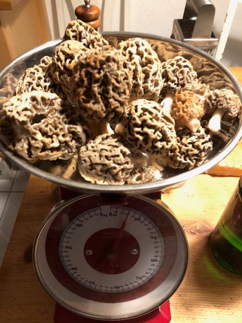 da stand ein gutes Dutzend schöner, frischer Speisemorcheln der Varietät Rundmorcheln (Morchella esculenta var. rotunda).300 Gramm brachten sie auf die Waage (Foto rechts).