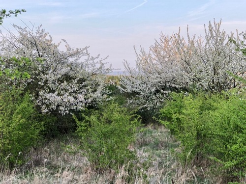 Foto: Eine verbuschte Landschaft mit blühenden Schwarzdornsträuchern und erheblichem Trockengrasanteil und - hier nicht zu sehenden - Eschen - war das Habitat, in dem Felix seine Speisemorcheln fand. (2 Fotos © Felix B.)