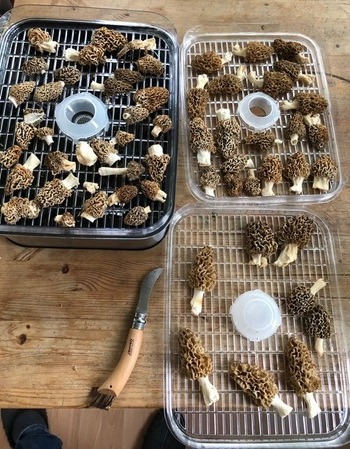 Foto: Sieben auf einen Streich! Die Suche nach den herrlichen Speisemorcheln war für Felix das reinste Vergnügen. Auf den Dörrgittern (zweites Foto) präsentiert er die gesamte Ausbeute. (2 Fotos © Felix B.)