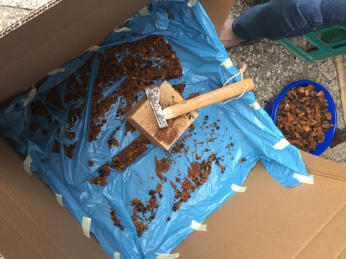 Foto: In einem mit einer Folie ausgelegten Karton schlug Heike die groben Stücke vom Schiefen Schillerporling auf einem Holzklotz klein.