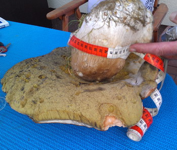 Foto links: Und zu guter Letzt die amtliche Vermessung. Auf 41 Zentimeter Umfang bringt es der Stiel! (Foto © Klaus, privat)
