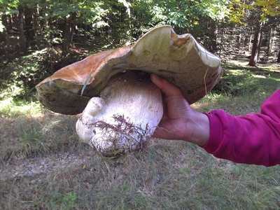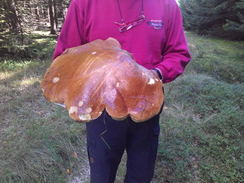 Der Tag bescherte uns aber Besonderes: Ich fand einen Steinpilzriesen von 2980 Gramm! Du liest richtig, magere 20 Gramm fehlten an drei Kilo! Der Stielumfang dieses Brockens vom Brocken betrug 41 Zentimeter! Ein Riesenstück!