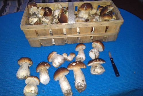 "Nähe Harzgerode: Nach zwei Stunden einen Korb voll Steinpilze ,jede Menge hühnereigroße Flaschenstäublinge, einige Goldröhrlinge und Maronenröhrlinge sowie geschlossene Riesenschirmpilze. Kurt Tauer"