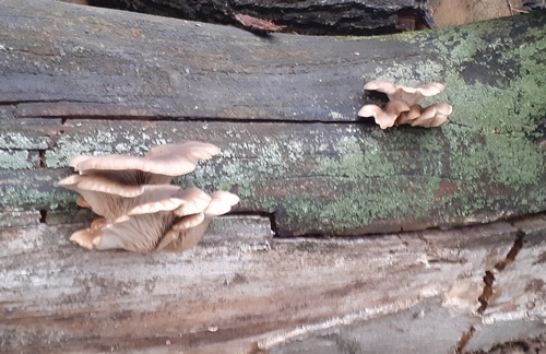 Beim Spaziergang entdeckten wir an einer gefällten Buche einige Austernseitlinge, die nach diesem Foto sogleich geerntet wurden. Am folgenden Tag aßen wir sie gebraten mit Ei, was sehr lecker war.