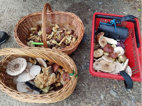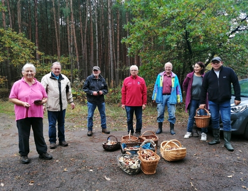 Das Gruppenbild mit uns, das ein Pilzfreund aus Hannover freundlicherweise machte, zeigt unsere Ausbeute. Ich durfte dann noch ein Foto mit den vollen Körben der Sammler aus Hannover machen, zu sehen auf dem Foto rechts.