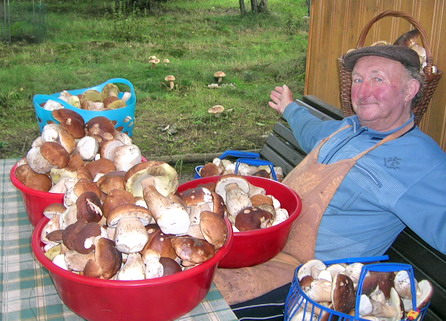 Foto: War das ein Steinpilz Jahr, 2006! Monikas Vater† will mit seiner Geste andeuten: Schaut her, mehr als genug! Sogar hinten, im eigenen Garten, prangen die Steinpilze. Und wer genau hinschaut, wird entdecken: Sie wachsen dem Vater gar über den Kopf... Das Foto ist ein bemerkenswertes Dokument zu einem ganz und gar außergewöhnlichen Pilzjahr (Foto © Monika Tahl).