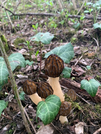 Foto: Nach einem Tipp mit genauer Ortsbeschreibung fand Ingeborg diese schönen Speisemorcheln in einem Eschenwaldstück. Auf dem 2. Foto sehen wir fünf Käppchenmorcheln, grazil und anmutig. (2 Fotos © Ingeborg)