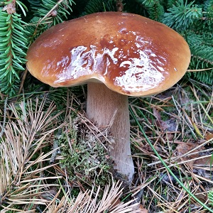 Foto: Welch ein herrlicher Steinpilz! Form und Farbabstufungen seines Hutes sowie sein stämmig-walziger Stiel lassen dieses Prachtexemplar, das sich uns im besten Alter präsentiert, unnachahmlich erscheinen.