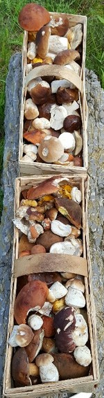 Foto rechts: Beinahe eine Girlande bilden die zwei bildschönen Pilzkörbe, die Kerstin & Familie zusammengetragen haben. Zu erkennen sind Steinpilze, Rotkappen, Maronen und hin und wieder ein Pfifferling. Welch ein schöner Pilzgang muss das gewesen sein!