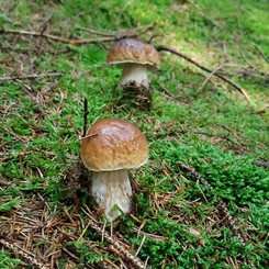 2 Fotos: Wir sehen links zwei von vier Steinpilzen, die Heike gefunden hat, und rechts ein unter Farnkraut verborgenes Nest mit Goldröhrlingen. (3 Fotos © Heike)