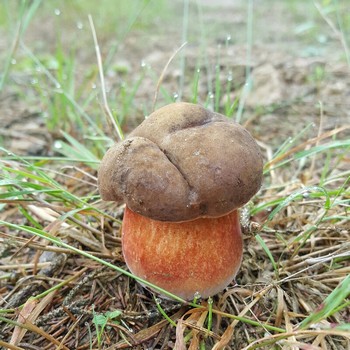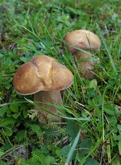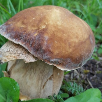 Es dauerte auch nicht lange. Auf einer waldnahen Wiese standen die ersten Raufußröhrlinge und die heiß ersehnten Steinpilze. Wir hielten sie zunächst ebenfalls für Raufußröhrlinge, da ihre Hutfarbe verblüffend ähnlich war. Zu unserer großen Freude standen da auf drei Quadratmetern acht wunderbare Steinis. Einen zeigt das erste Foto.