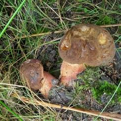 2 Fotos: Es muss ein Pilzgang wie im Märchenwald gewesen sein. Die Flockenstieligen Hexenröhrlinge (links), und die Steinpilze (rechts) standen da wie im Bilderbuch. (4 Fotos © Kerstin)