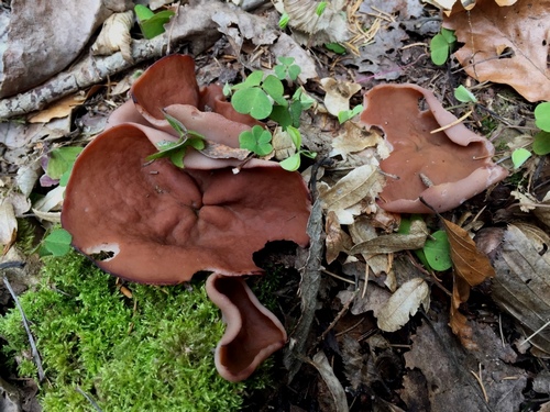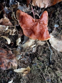Foto: Die Scheibenlorcheln bzw. Größten Scheiblinge hat Heike ausnahmslos im Fichtenwald gefunden, was eindeutig auf ebendiese und nicht auf Morchelbecherlinge schließen lässt, auch wenn die herübergewehten Laubblätter Letzteres vermuten lassen. (3 Fotos © Heike)