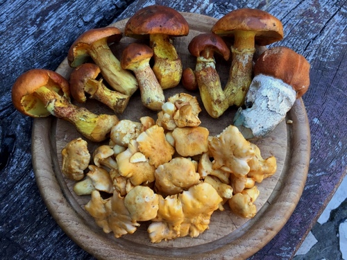 Auch von den schönen Goldröhrlingen, die ich extra stehen gelassen hatte, war nichts und gar nichts mehr zu sehen. So blieben für mich vier Sommersteinis, leider schon etwas überständig, drei Schwarzblauende Röhrlinge, ein Hainbuchenröhrling und eine Handvoll Pfifferlinge.