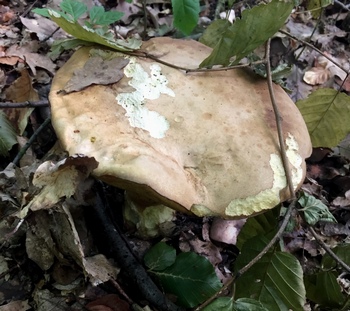 Ich nahm nur den Kleineren mit, der Große maß cirka 20 Zentimeter im Durchmesser, Höhe etwa gleich. Zunächst vermutete ich einen Sommersteinpilz, doch zu meinem Erstaunen waren die Röhrenmündungen quittegelb.