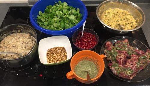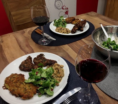 Dazu Kräuterröstis mit fast gleichen Zutaten aus dem Garten und Steinpilzen. Den Feldsalat dazu gab es mit Granatapfel und gerösteten Pinienkernen. Ein staubtrockener schwerer Rotwein darf nicht fehlen.