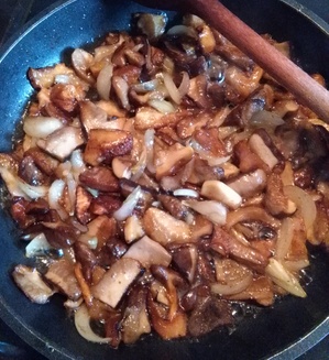 So blieben uns nur ein paar Pfefferröhrlinge, wenige Maronen, ein Steinpilz, drei brauchbare Fichtenreizker und zwei größere Pfifferlinge. Die Pilze sind bereits gebraten und duften herrlich (zweites Foto).
