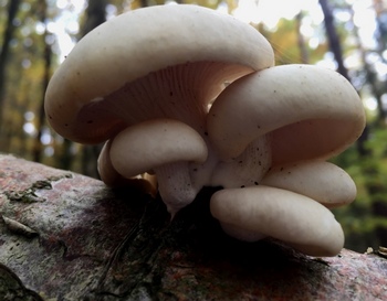 Doch leider waren die meisten von unten nicht mehr schön. So blieben mir noch 2 Kilo. Wäre ich vier Wochen früher am Ort gewesen, hätte ich eine ganze Schubkarre voll abtransportieren können. Etwas weiter entdeckte ich wieder eine neue tolle Stelle mit Trompetenpfiffis. Doch auch die waren leider schon zu alt. Auch eine Stelle mit wahrscheinlich Rillstieligen Seitlingen (zweites Foto rechts) fand ich.
