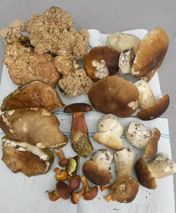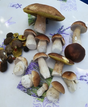 Er hat eine schöne Mischung aus Flockis, Sandröhrlingen, Pfifferlingen, Maronen, Steinpilzen und einer Glucke an seiner bewährten Ecke mit Laub-und Fichtenwald gefunden. Es scheint jetzt wirklich noch was zu werden nach der langen Dürre.