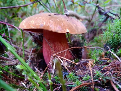 Immerhin war der Waldweg frei, so dass wir gut weiterlaufen konnten. Es dauerte auch nicht lange und ich fand im Gras die ersten Rotfußröhrlinge. Wir gingen diesen Weg weiter und fanden tatsächlich die ersten zwei Steinpilze. Welche Freude! Wahnsinn, das hätte ich nie gedacht. Dannach suchten wir noch neben dem Weg unsere bekannten feuchten Grasstellen ab - und unsere Freude wurde immer größer.