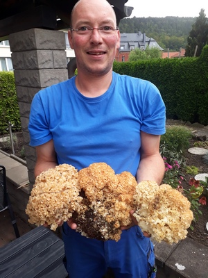 posten, auf dem er stolz drei köstliche Krause Glucken zeigt. Wenigstens sie wachsen, während viele andere Arten ja noch auf sich warten lassen.