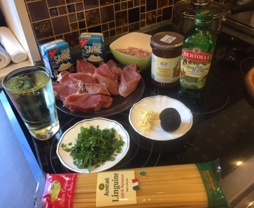 Foto: Hier sind die Zutaten für Heikes Trüffelrahmsoße auf Pasta zu sehen. Die Trüffel (auf dem kleinen Teller) kann eine Périgordtrüffel oder eine Sommertrüffel sein (Burgundertrüffeln sind mit Sommertrüffeln, wie man seit Neuestem weiß, genetisch zu 100% identisch). (2 Fotos © Heike)