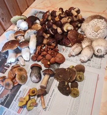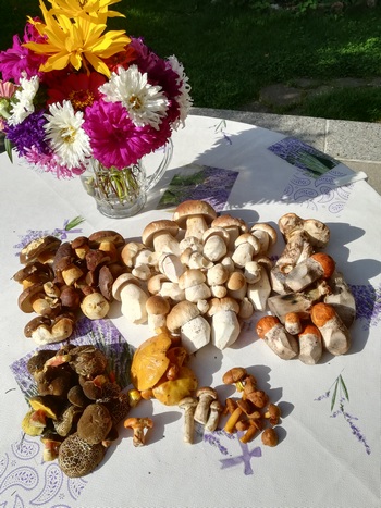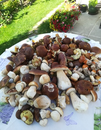 Champignons, Parasolpilze, Reizker, Butterpilze, Goldröhrlinge, einige wenige Maronen, Pfifferlinge sowie ein Steinpilz waren unsere Ausbeute.