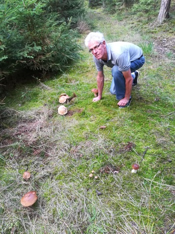 Auf dem zweiten Foto zeigt Bernd, dass die Steinpilze derzeit nur auf oder an Waldwegen und am Waldrand wachsen, nicht im Waldesinneren.