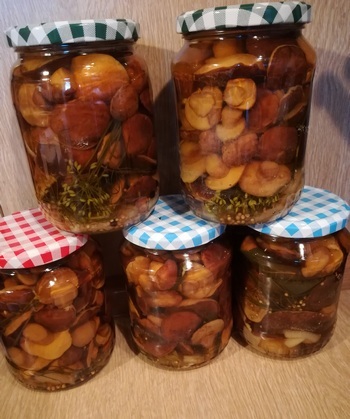Auf dem letzten Foto sind 5 Gläser sauer eingeweckte Pilze. Wir haben sie unlängst zu Bernds 70. Geburtstag probiert - einfach lecker!