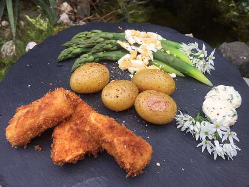 Der Schwefelporling wurde in Panko (Paniermehl nach asiatischer Art) paniert und zu Nuggets ausgebacken. Dazu gab es einfach grünen Spargel, Ei, Drillinge und Bärlauchblütenbutter. Lecker war es!