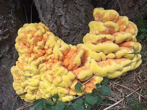 Gleich der erste aufgesuchte Baum bescherte uns Erfolg. Hoffentlich ist es kein schlechtes Omen, was man ihm bekanntlich ja nachsagt. Der Schwefelporling hatte eine beachtliche Größe, er war nämlich über 60 Zentimeter breit. Noch jung und frisch, quoll er voller Kraft aus dem Baum heraus. Circa die Hälfte ernteten wir, was stolze drei Kilogramm ergab. Allein zwei Kilo bekam unser Nachbar ab.