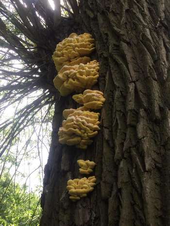 Das Omen nimmt seinen Lauf, denn die Schwefelporlinge quellen hier derzeit an unzähligen Bäumen hervor. Das habe ich in solcher Quantität noch nie erlebt.