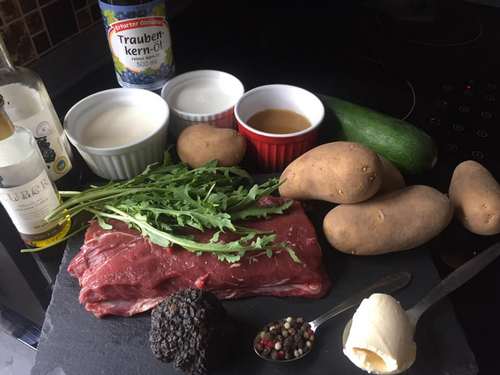 Foto: Überblick der Zutaten für Heikes Damwildrücken mit Kartoffelstampf