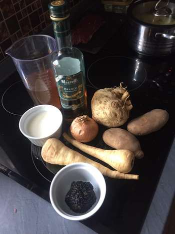 Foto rechts: Hier sehen wir die Zutaten für die Trüffelcrèmesuppe. Mit im Spiel sind Gemüsebrühe, Weißer Balsamico, Sahne, Sellerieknolle, Zwiebel, 2 Kartoffeln, zwei Pastinaken und eine Trüffel.