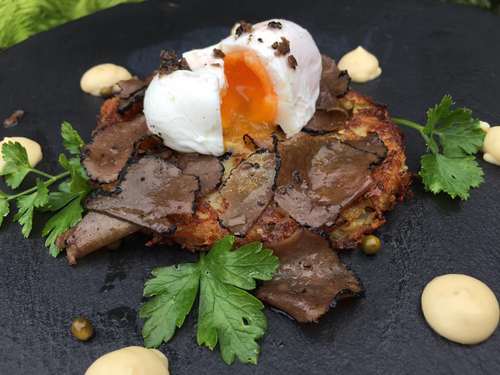 Pochiertes Ei: Wasser mit Essig aufsetzen, das in eine Tasse gegebene Ei in das kochende Wasser (vorher strudeln!) geben und ca. 2 Minuten ziehen lassen. Rösti auf Teller, Trüffelcarpaccio darauf, Pochiertes Ei darüber. Drum herum die Trüffelsahne mit einem Teelöffel drapieren, sehr wenig Petersilie dazu - fertig.