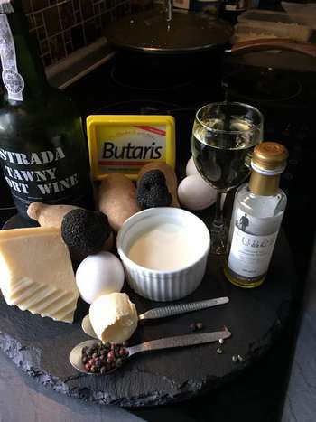 Foto: Und hier noch ein Überblick über die Zutaten für die Trüffelbutte - Einzelheiten im Text. Welch ein grandioser Schnellkurs in der Spitzenküche der Pilze!
