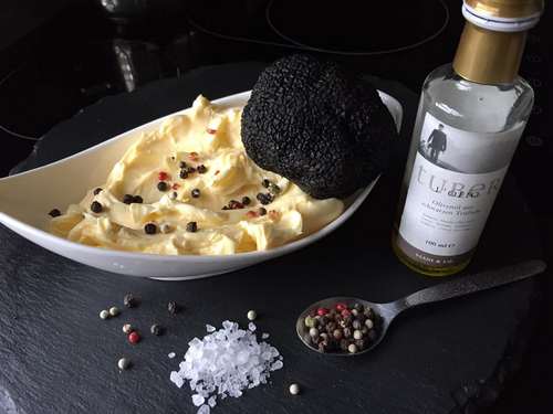 Butter, Salz, Pfeffer aus der Mühle, nur sehr wenig Trüffelöl, Trüffel fein schneiden und dann mörsern. Das Aroma rauskitzeln! Die weiche Butter in eine Schüssel geben, mit Salz, Pfeffer und dem gemörserten Trüffelanteil gut vermischen.