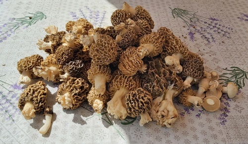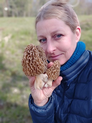 Foto: Ein ganzer Batzen herrlicher Speisemorcheln. Es war Yvonnes erster Morchelfund und sie vermutet, dass sie dort wuchsen, wo schon ihr Großvater Speisemorcheln gefunden hatte. Das zweite Foto zeigt Yvonne mit einer großen und einer kleinen Speisemorchel. (2 Fotos © Yvonne)