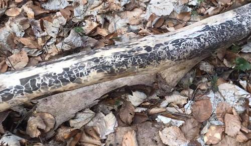 Foto: Erinnert an das Fellzeichnung einer Giraffe: Giraffenholz im Ohmgebirge. Das Myzel dieses Pilzes zersetzt Holz und bildet weißes Flecken und Flächen. Verschiedene Myzelarten, also Pilzarten, bewirken dies.