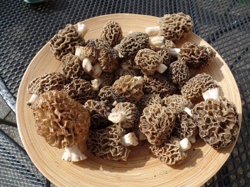 Nach etwa 200 Metern sah ich die ersten Morcheln, diesmal gut getarnt. Aber wenn sich das Auge erstmal auf Morcheln eingestellt hat, gibt es kein Entkommen mehr. Innerhalb kurzer Zeit kamen 8 schöne Speisemorcheln zusammen, dann noch eine hier und eine da und plötzlich waren es so viele, dass ich sie kaum mehr bis zum Auto schaffen konnte!
