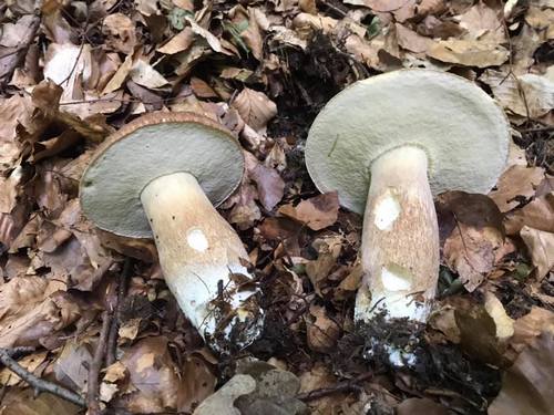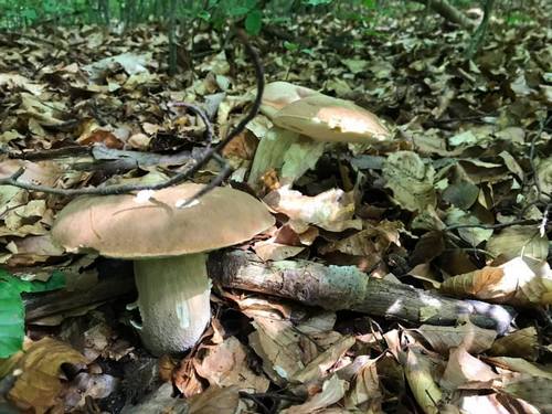 Foto: Hier noch zwei der Pilze im Laubwald. Seit Jahren ist diese Stelle Heikes einziger Platz mit Sommersteinpilzen.