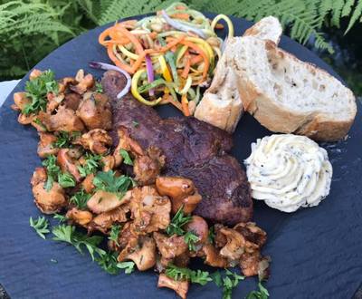 Es gab dann gestern Abend Leber vom Schwarzwild mit Pfifferlingen und Baquette mit Steinpilzbutter. Dazu gab es frischen Salat (1. Foto rechts).