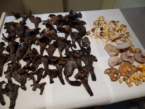 Im Hintergrund auf dem Foto rechts liegen Birkenpilze, davor ein paar Maronen, sehr viele Trompetenpfifferlinge und die herrlichen Herbstrotfüßchen, gelb mit ganz dunklem Hut. Ein voller Dörrautomat arbeitet bereits in der Küche.