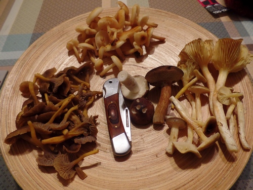 Am 1. November war meine Ausbeute recht vielfältig. Dazu gehörten eine ganze Menge stattlicher Rotkappen, viele noch ganz junge Sandröhrlinge, die es bei uns schon seit 14 Tagen in Massen gibt, einige Violette Rötelritterlinge, zwei Habichtspilze, einige Maronen und Pfifferlinge sowie auch schon die ersten Schwarzfaserigen Ritterlinge (Schneepilze).