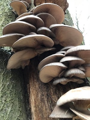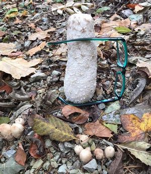 Und Austernseitlinge kommen auch enorm. Überall sind sie zu entdecken. Hier und da gibt es prächtige Stockschwämmchen und riesige Schopftintlinge, auf dem 2. Foto rechts beäugt von einer neugierigen Brille.