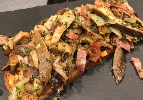 Foto: Schmackofatz wie aus dem Bilderbuch. Heike hat die ersten Austernseitlinge in ausgelassenem Speck vom Schwarzwild gebraten, mit Zwiebeln, Gewürzen und frischen Kräutern verfeinert und zusätzlich mit Wildschinken eigener Herstellung veredelt.