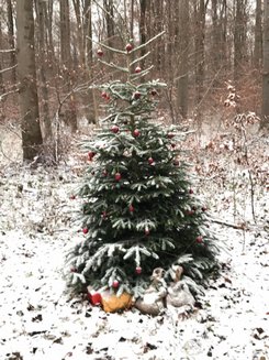2 Fotos: An Nachwuchs mangelt es nicht bei den Austernpilzen. Ein Tannenbaum im Wald, wohl von Kindern geschmückt, kündigt den Pilzen an, dass der Weihnachtsmann demnächst zur Begutachtung vorbeikommt.